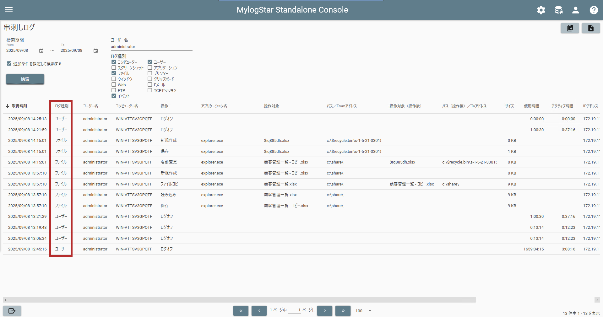 ユーザーID、端末、時刻、操作内容を完全に記録可能 |